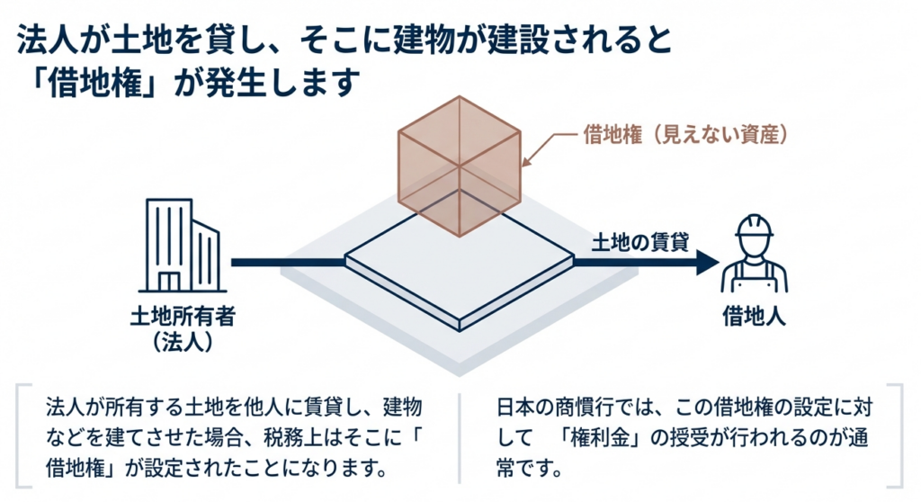法人が所有する土地に、他者が資金を投じて建物を建設するということは、その土地に「借地権が設定された」と評価されます。借地権は財産的価値を持つ権利です。