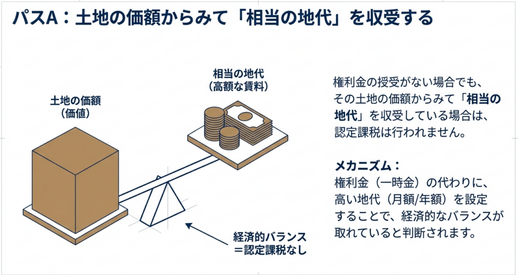 一つ目の回避方法は、その土地の価額からみて「相当の地代」を収受している場合です。権利金の代わりに、適正な額の地代を継続的に受け取ることで、認定課税の対象外となります。