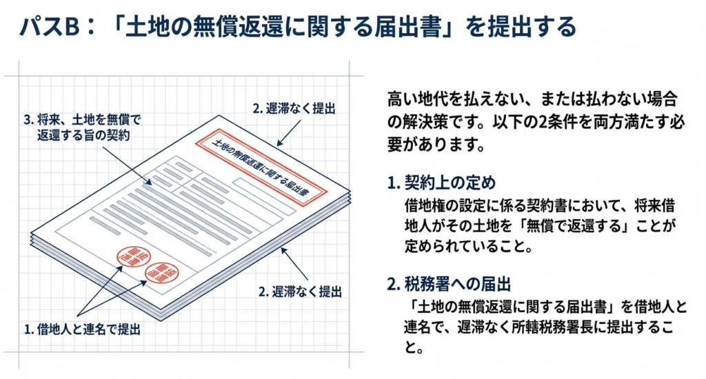 第二に、将来の無償返還を契約書に定め、「土地の無償返還に関する届出書」を借地人と連名で税務署長へ遅滞なく提出している場合です。
