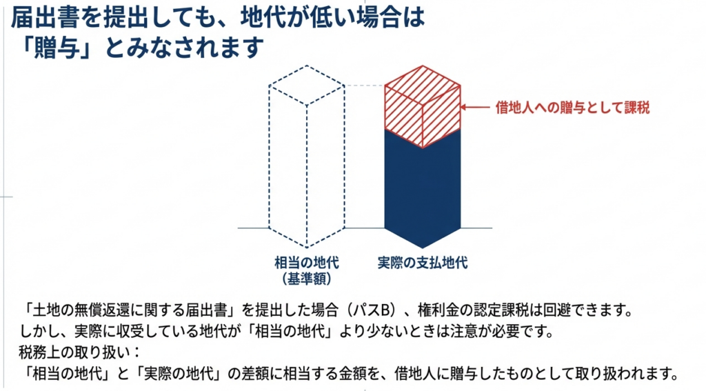 この2つが揃って初めて、認定課税を回避することができますが、このケースには重大な注意点が存在します。この届出書を提出した場合でも、実際に収受している地代が前述の「相当の地代」よりも低い水準にある場合、その差額に相当する金額は、法人(貸主)から借地人へ贈与されたものとして取り扱われます。これは、貸主側だけでなく、借主側で受贈益として課税される可能性を示唆しており、契約当事者双方にとって重要な論点となります。