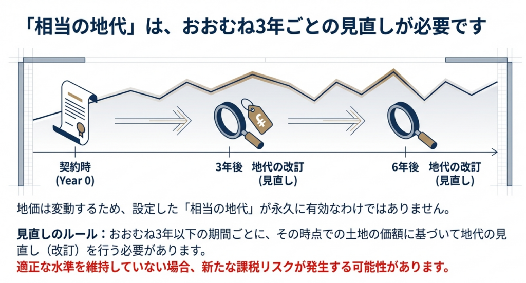 「相当の地代」は、土地の価額の変動などを反映させるため、おおむね3年以下の期間ごとに見直しを行う必要があります。