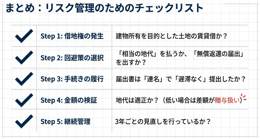 特に「土地の無償返還に関する届出書」を提出する方法を選択する場合、①契約書への無償返還条項の記載と、②税務署への届出書の「遅滞なく」の提出という2つの手続きを絶対に漏らしてはなりません。実務上、契約書は完璧でもこの届出書の提出を失念するケースは散見され、税務調査で指摘される典型的な項目の一つとなっています。くれぐれもご注意ください。