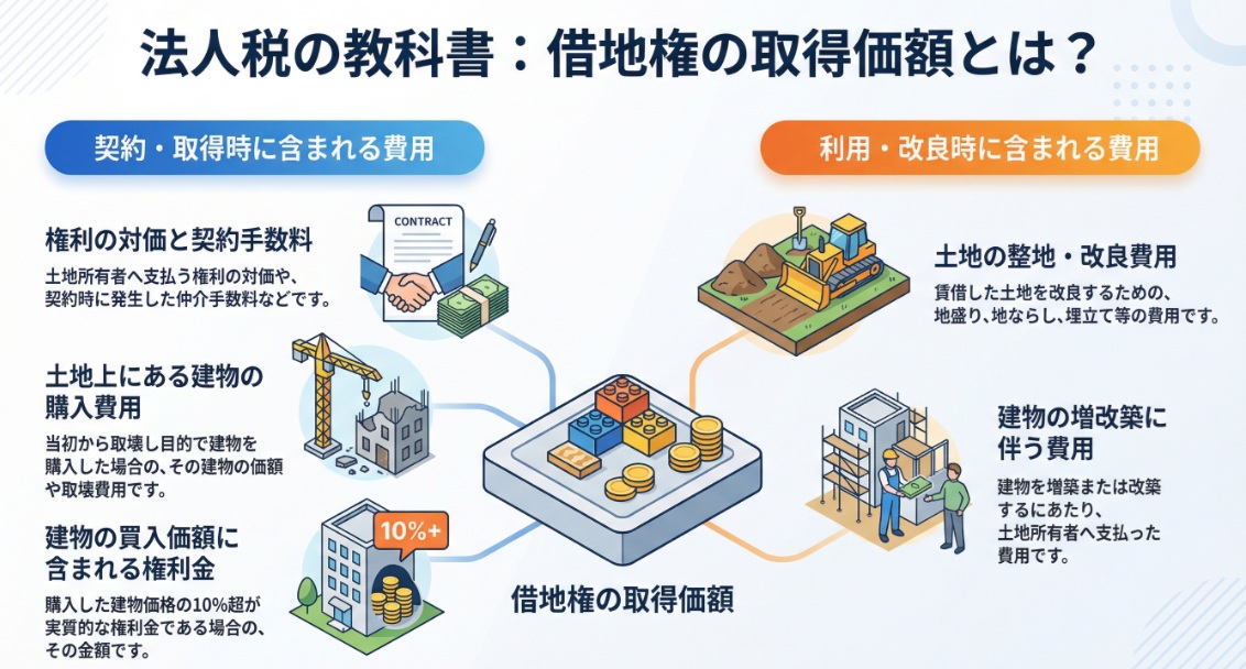 特殊なケースとして、当初から取壊しを目的として建物付き借地権を取得した際の建物の帳簿価額や取壊費用、あるいは建物購入代金のうち借地権の対価が含まれている場合のその金額(概ね10%超の場合)も算入されます。これらは資産として計上すべき重要な項目です。