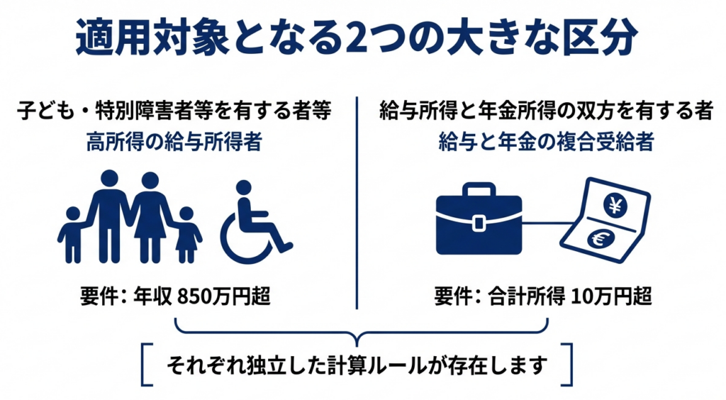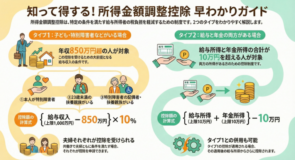 所得金額調整控除には2種類あります。一つは「子ども・特別障害者等を有する者等の所得金額調整控除」で、もう一つは「給与所得と年金所得の双方を有する者に対する所得金額調整控除」です。