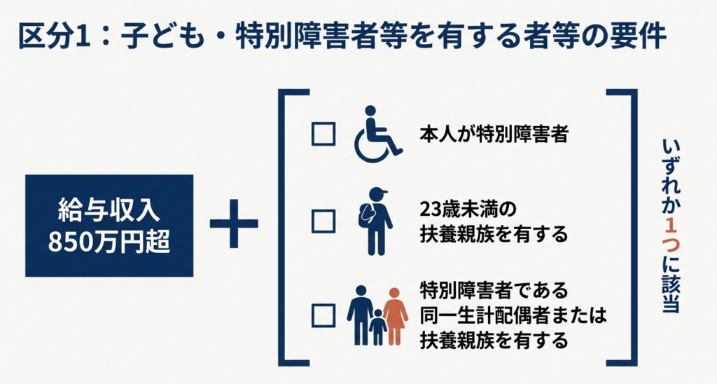 適用対象者となる3つの条件は、「本人が特別障害者に該当する」「年齢23歳未満の扶養親族を有する」「特別障害者である同一生計配偶者または扶養親族を有する」のいずれかに該当することです。