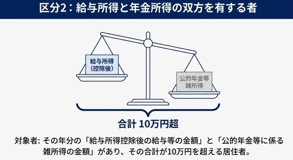 その年分の給与所得控除後の給与等の金額と、公的年金等に係る雑所得の金額があり、その合計額が10万円を超える居住者が対象となります。