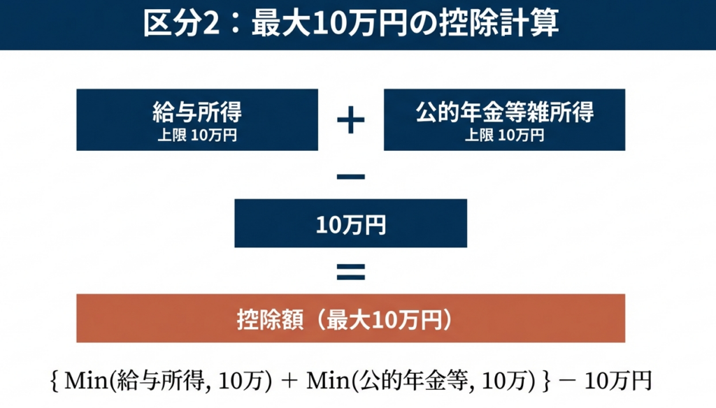 {給与所得控除後の給与等の金額(上限10万円) + 公的年金等に係る雑所得の金額(上限10万円)} - 10万円