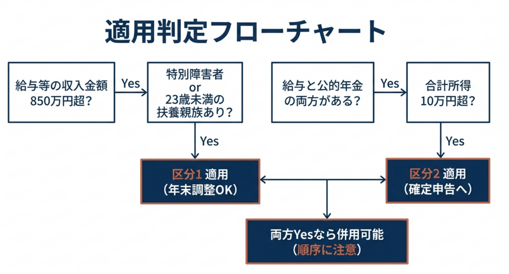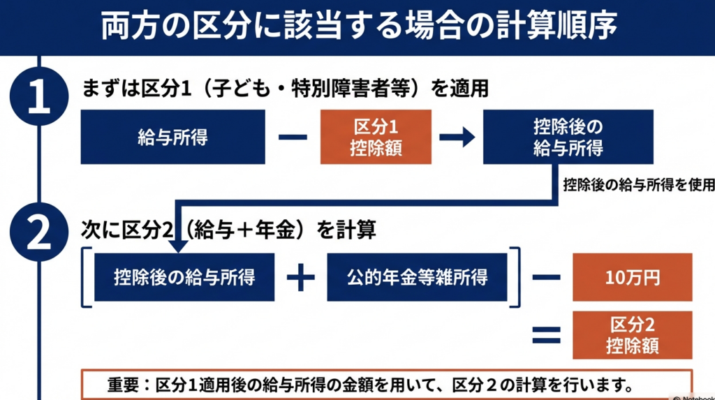 ある人が両方の控除の適用対象となる場合、まず「子ども・特別障害者等を有する者等の所得金額調整控除」を適用します。その後、その適用後の給与所得の金額から「給与所得と年金所得の双方を有する者に対する所得金額調整控除」を控除します。