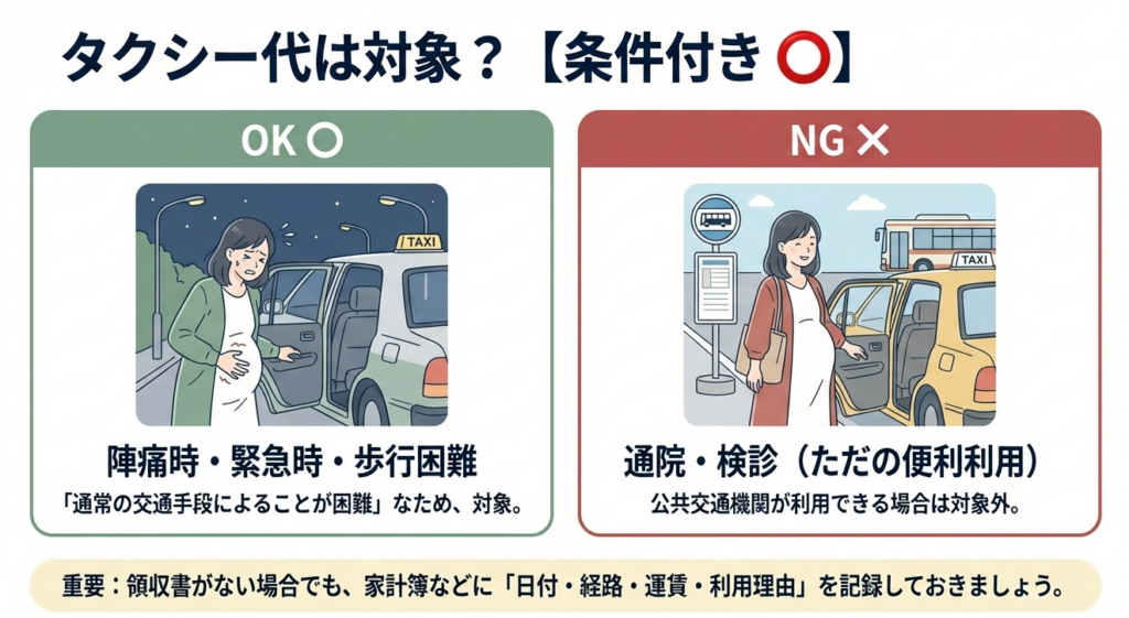 これは、単なる交通費ではなく、「陣痛や破水により、電車やバスといった公共交通機関を利用することが現実的でない、または危険を伴う」といった緊急性が認められる場合に限られます。そのため、医療を受けるための「やむを得ない支出」と見なされ、控除対象となります。