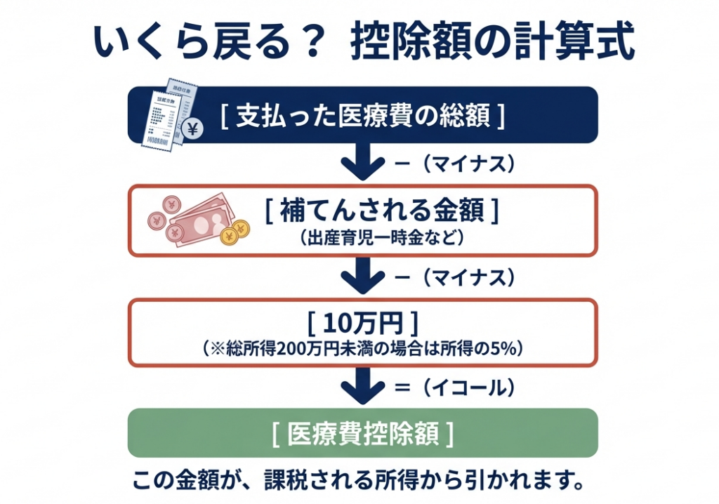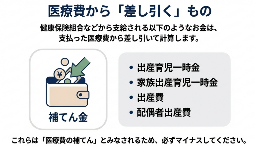 控除額の計算にあたっては、「出産育児一時金」などの給付金を医療費から差し引く必要があります。ただし、産休による給与補填としての「出産手当金」は、医療費を補填するものではないため、差し引く必要はありません。