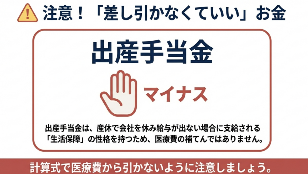 いいえ、差し引く必要はありません。出産手当金は、出産の前後の一定期間勤務できないことに対する所得補償の性格を持つ給付であり、医療費そのものを補てんするものではないため、医療費控除の計算からは除外されます。
