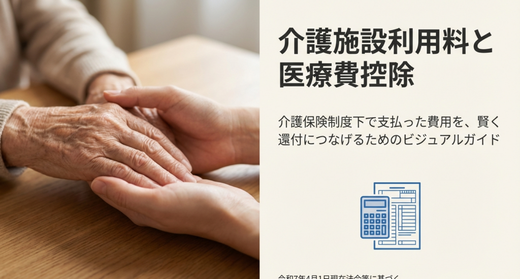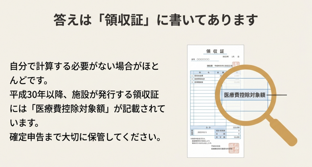 なお、理美容代などの日常生活費や特別なサービス費用は原則として対象外です。施設が発行する領収書には通常、医療費控除の対象となる金額が記載されているため、それに基づき申告します。