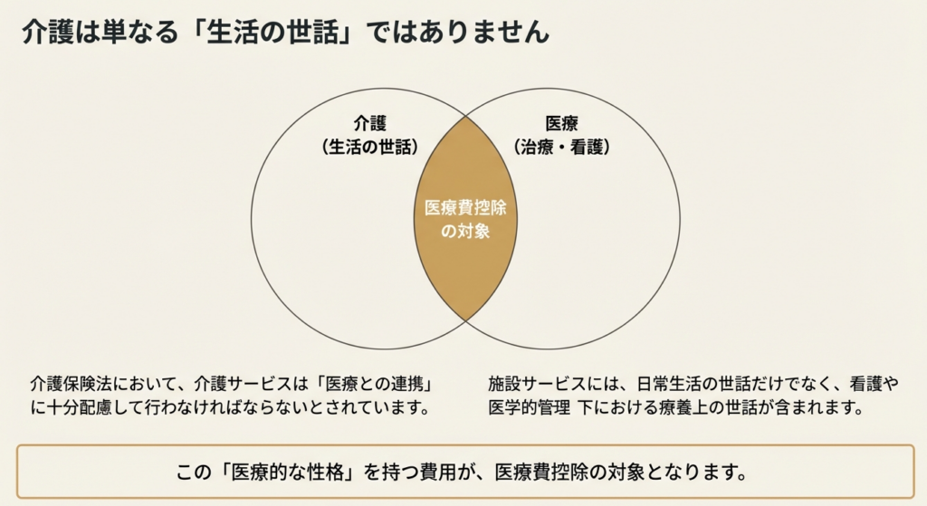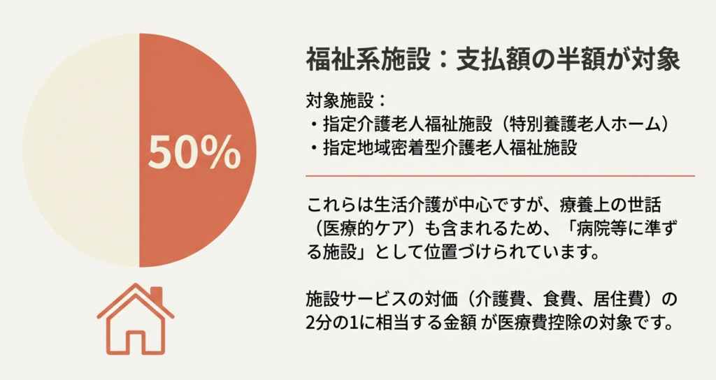 なぜ「全額」ではなく「2分の1」なのか、その背景には所得税法上の位置づけがあります。これらの施設は、生活の場という側面が強いものの、介護保険制度のもとで健康管理や療養上の世話も行われることから、所得税法上は「病院」や「診療所」に準ずる施設として扱われます。そして、提供されるサービスのうち、医療的な性格を持つ「療養上の世話」に相当する部分が、支払った対価の半分であると解釈されているため、このような取扱いとなっています。