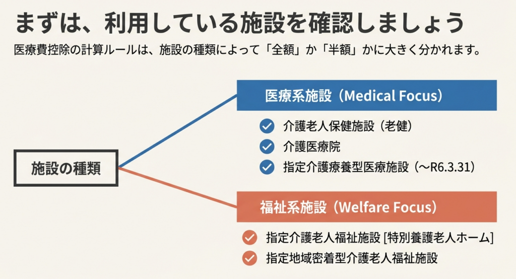 多岐にわたる介護サービスの中で、医療費控除の対象額を判断する上で最も重要な基準は、サービスを受けている方が「どの種類の施設に入所しているか」という点にあります。この点を最初に把握することが、クライアントへの迅速かつ的確なアドバイスにつながる第一歩となります。