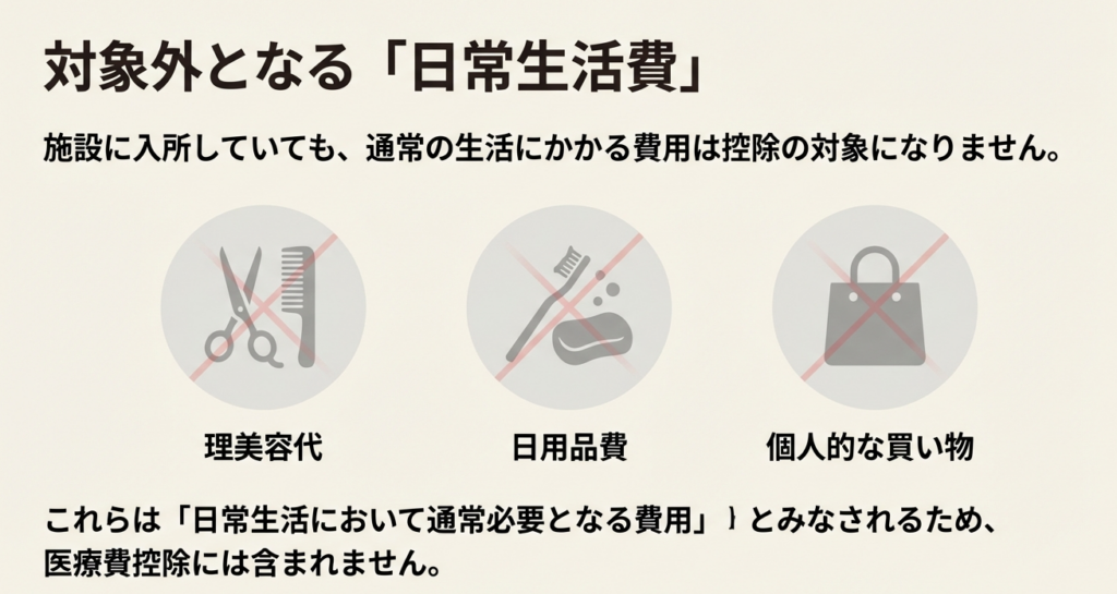 一般的に医療費控除の対象外となるのは、「日常生活費」と「特別なサービス費用」です。日常生活費には理美容代などが含まれます。