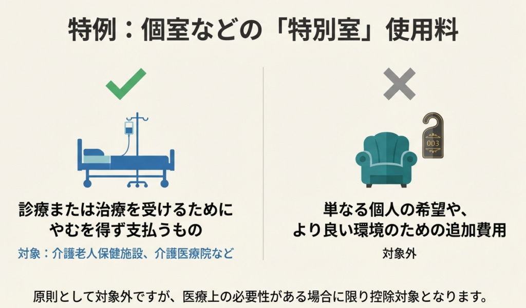 原則として医療費控除の対象外となる「特別なサービス費用」の中にも、例外的に控除対象となりうる項目があります。その代表例が「特別室の使用料(差額ベッド代など)」です。