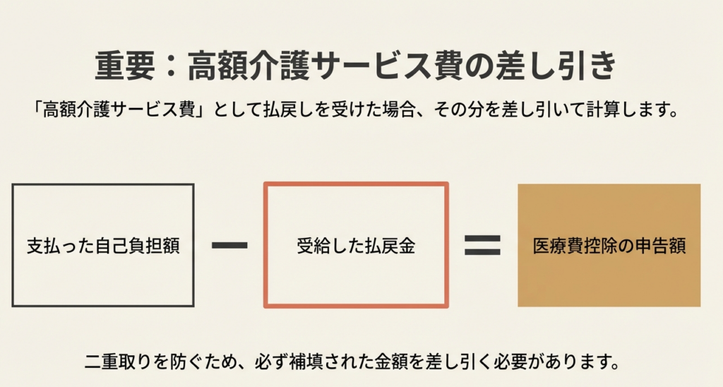 高額介護サービス費として払戻しを受けた場合、その金額を医療費の合計額から差し引いて控除額を計算する必要があります。特に指定介護老人福祉施設の場合、払戻し額の2分の1に相当する金額を差し引きます。