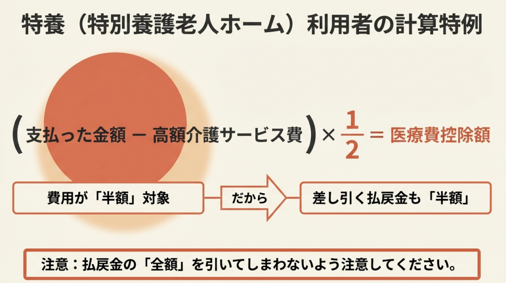 特に注意が必要なのは、指定介護老人福祉施設および指定地域密着型介護老人福祉施設のサービス費に対する払戻しを受けた場合です。この場合、控除対象となる医療費が元々支払額の2分の1であるため、差し引く払戻し額も「その払戻し額の2分の1に相当する金額」となります。この特殊なルールは見落としやすいポイントですので、確実に確認してください。
