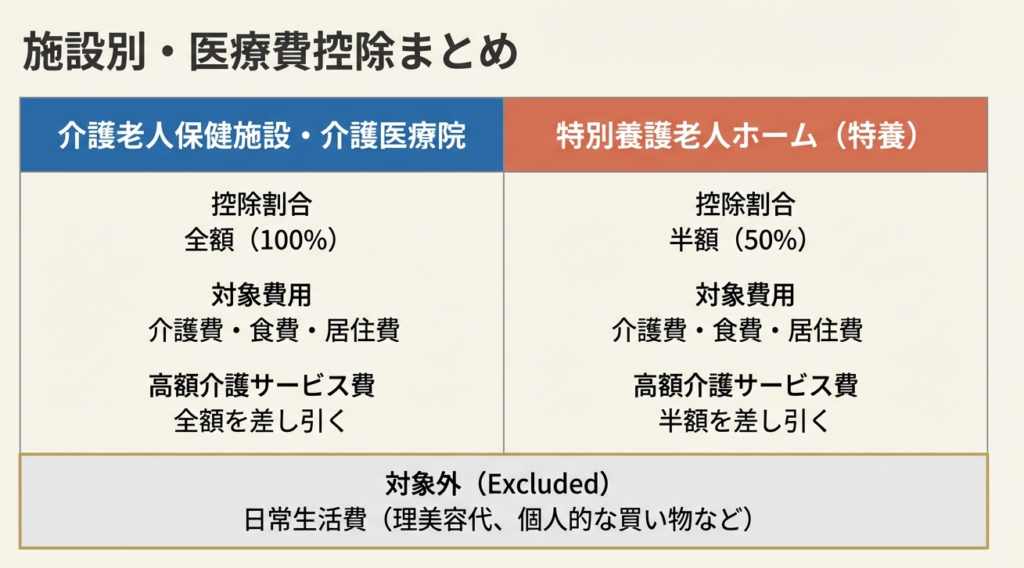 これらの施設種別における医療費控除のルールは、「施設サービスの対価(介護費、食費および居住費)に係る自己負担額として支払った金額の2分の1に相当する金額」が対象となる、というものです。