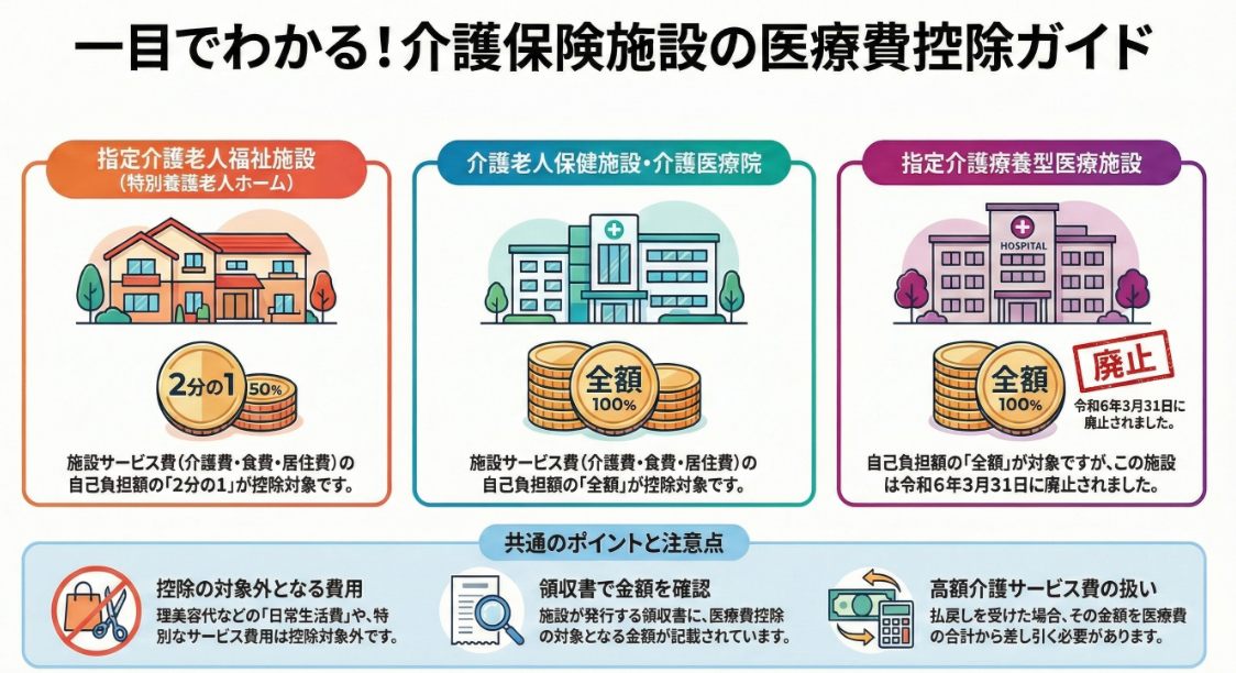 医療費控除の対象となるサービスを受けられる施設は、(1)指定介護老人福祉施設(特別養護老人ホーム)および指定地域密着型介護老人福祉施設、(2)介護老人保健施設、(3)指定介護療養型医療施設(令和6年3月31日まで)、(4)介護医療院の4種類です。