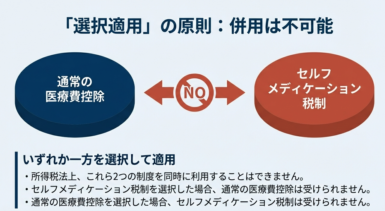 セルフメディケーション税制と通常の医療費控除は、どちらか一方しか適用できない「選択適用」の関係にあります。したがって、納税者はどちらか一方を選択して、控除の適用を受けることになります。