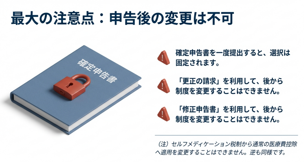 これは、例えば申告後に高額な医療費の領収書が新たに見つかったとしても、既に選択したセルフメディケーション税制から通常の医療費控除へ切り替えることはできない、ということを意味します。