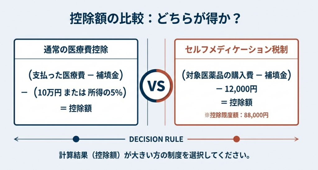 セルフメディケーション税制は医療費控除の特例であり、通常の医療費控除とは選択適用となります。つまり、いずれか一方しか利用できず、両方を併用することはできません。たとえ特例対象外の一般医療費が通常の控除の下限額(10万円または総所得金額等の5%)を超えていたとしても、セルフメディケーション税制を選べば通常の控除は一切受けられなくなります。