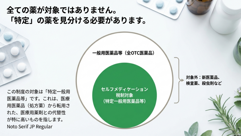 すべての市販薬(OTC医薬品)が対象となるわけではありません。基本的には、元々医療用として使われていた有効成分を市販薬に転用した「スイッチOTC医薬品」が制度の中心となります。
