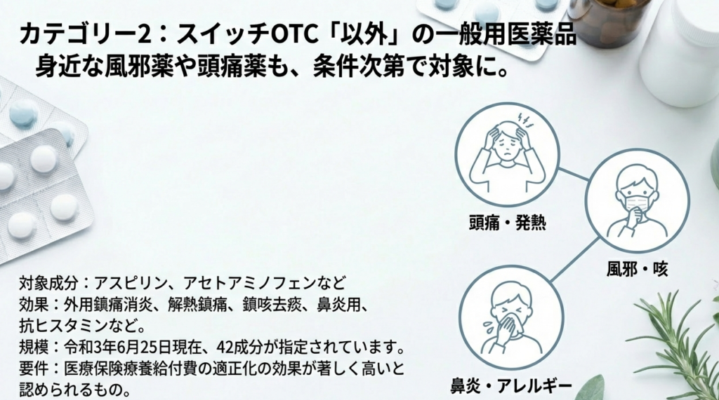 対象となるのは、(1)医療用薬剤との代替性が特に高いと定められたスイッチOTC医薬品など、および(2)スイッチOTC医薬品と同種の効能・効果を持ち、医療保険療養給付費の適正化の効果が著しく高いと認められる医薬品、の2つのカテゴリです。令和8年1月1日以降は、(1)の中から適正化効果が低いと認められるものが除かれます。