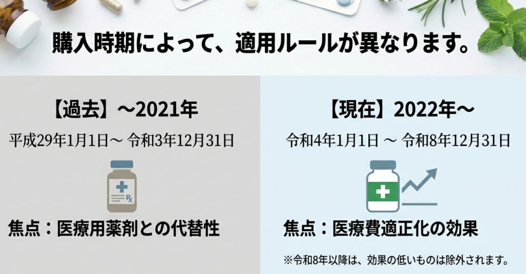 対象となる医薬品の定義は、その医薬品を購入した時期によって下表の通り異なります。特に令和4年1月1日以降は、対象となる医薬品が2つのカテゴリに分類されている点が重要です。
