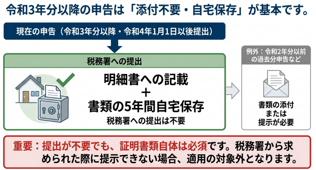 クライアントの申告が令和何年分であるかを正確に確認し、古い制度(添付・提示が必要)と新しい制度(添付不要・保管義務)のルールを混同しないよう、細心の注意を払ってください。