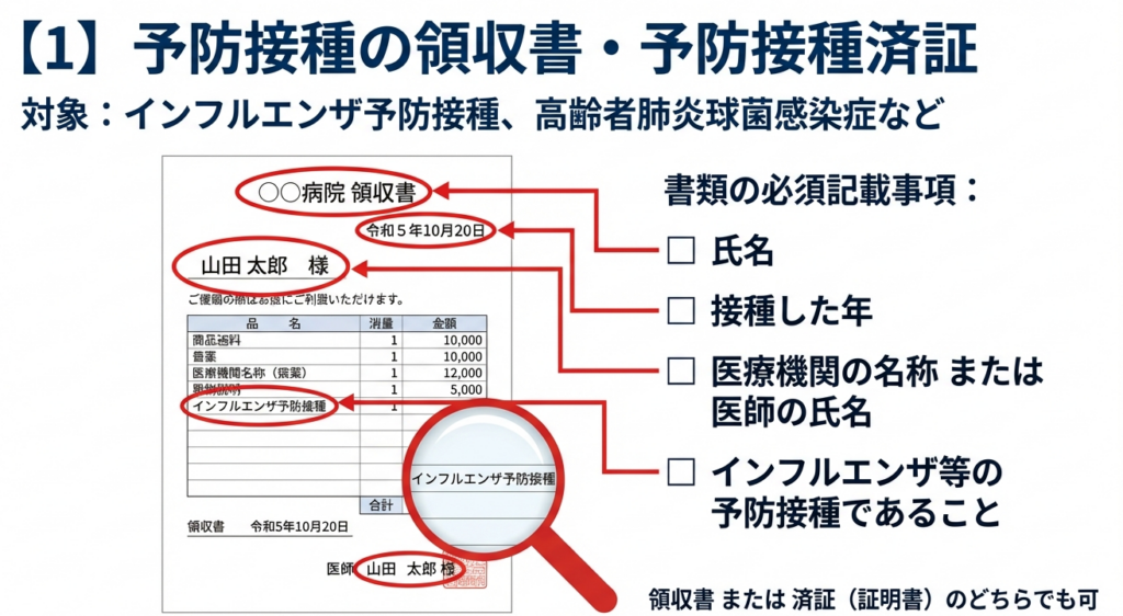 インフルエンザの予防接種の「領収書」または「予防接種済証」と、高齢者の肺炎球菌感染症等の定期予防接種の「領収書」または「予防接種済証」が該当します。