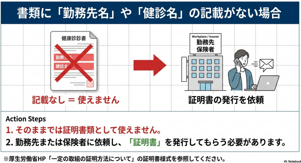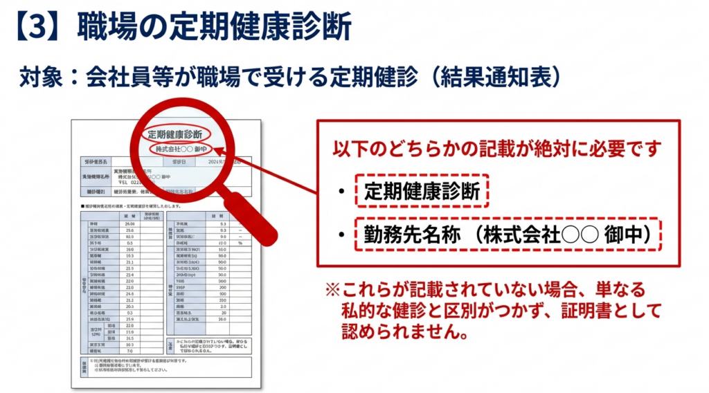 職場で受けた定期健康診断の結果通知表には、「定期健康診断」という名称、または「勤務先名称」のいずれかの記載が必要です。これらの記載がない場合は、別途証明書が必要になることがあります。