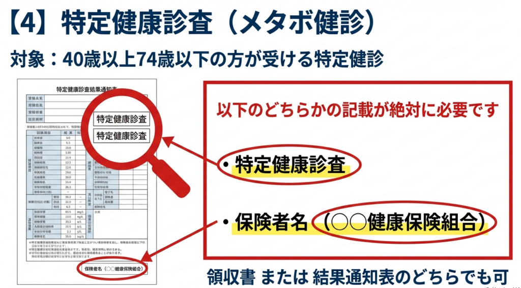 特定健康診査の領収書や結果通知表には、「特定健康診査」という名称、または「保険者名」のいずれかの記載が必要です。