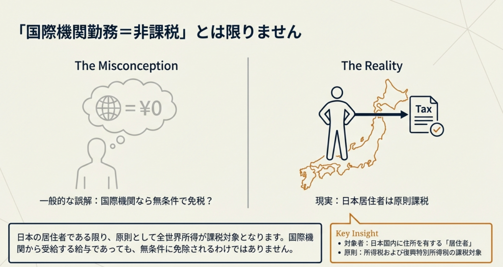 まず、なぜ国際機関からの給与が原則として課税対象となるのか、その根拠から確認します。これは、所得税法の基本的な考え方に基づいています。日本の「居住者」は、その所得が国内で発生したものか、国外で発生したものかを問わず、原則としてすべての所得(全世界所得)に対して日本で課税されることになっています。