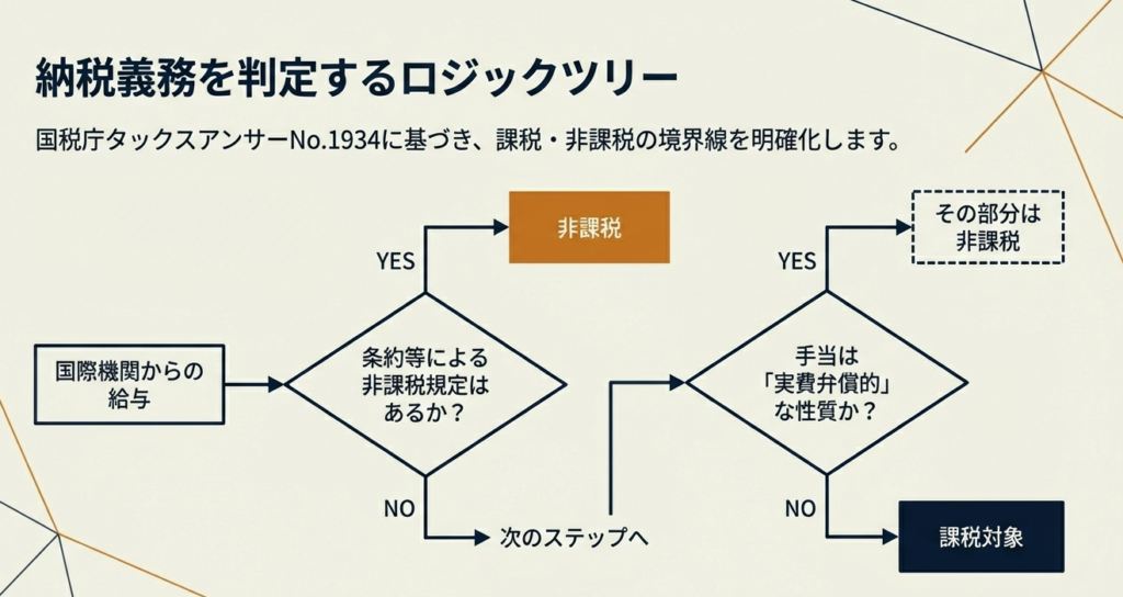 複雑な税務論点に取り組む際は、まず「原則」と「例外」という大きな幹をしっかりと押さえることが、実務における的確な判断の第一歩となります。この国際機関勤務者の給与課税についても、最初に結論となる基本的なルールを把握することが重要です。