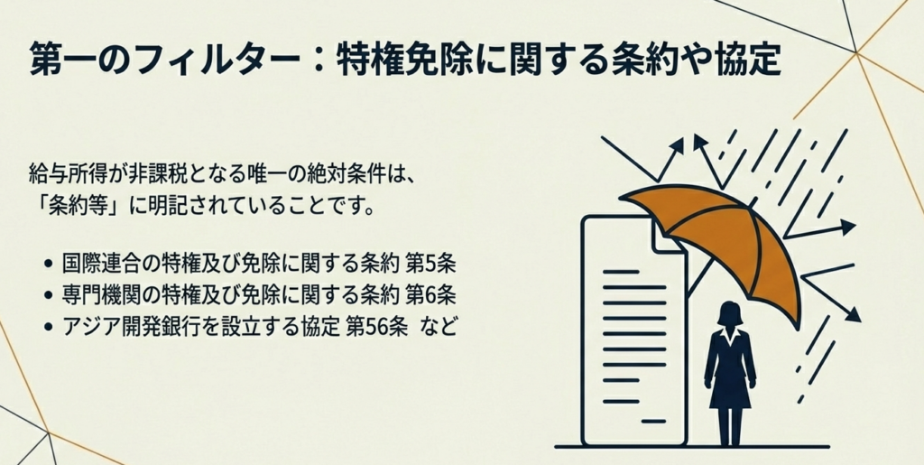 実務上、私たちが最も注意すべき点は、この非課税規定がすべての国際機関に一律に適用されるわけではない、という点です。個別の国際機関ごとに、その設立根拠となる協定や特権免除に関する条約が定められており、その中に給与に関する非課税規定が含まれているかどうかを個別に確認する作業が不可欠となります。