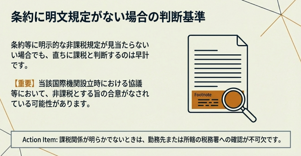 さらに、専門家として留意すべき点として、条約等に明示的な非課税規定が見当たらない場合でも、その国際機関の設立時の協議などにおいて、非課税とする旨の合意がなされている可能性も考えられます。したがって、条約の条文確認だけで完結せず、当該機関の設立経緯など、より深いレベルでの事実確認が求められる場合があることを念頭に置いてください。