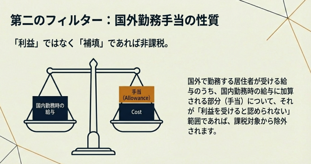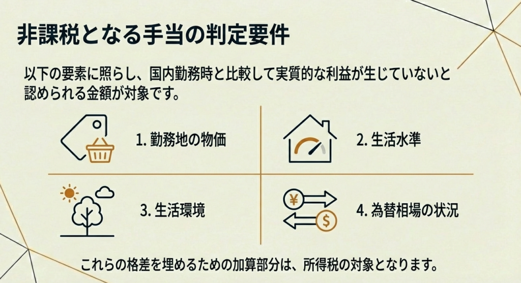 これは、国外勤務に伴い、日本国内で勤務していれば受け取るはずの通常の給与に「加算して支給される給与」、いわゆるハードシップ手当や在勤手当のようなものが対象です。具体的には、その加算部分のうち、現地の物価水準や生活環境などを考慮して、実質的に国内勤務の場合と比べて特別な利益を受けているとは認められない部分の金額については、非課税所得として扱われます。