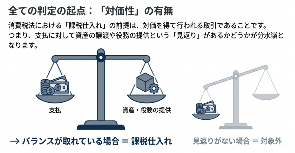 前章で示した結論の根拠となるのが、消費税法における「対価性」という基本原則です。課税仕入れとして認められるためには、その支出が「事業のために、対価を得て行われる資産の譲受けや役務の提供」に該当する必要があります。このセクションでは、この「対価性」の有無を軸に、寄附金と交際費の具体的な取扱いを解説します。