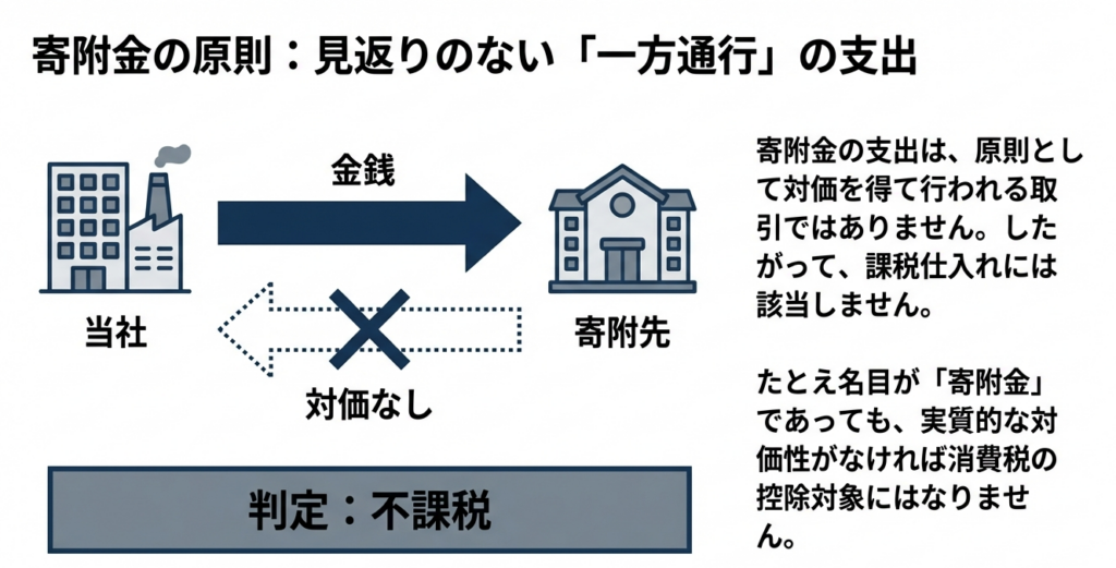 原則の解説 寄附金は、原則として「対価を得て行われる取引ではない」ため、課税仕入れには該当しません。これは、寄附が一方的な金銭の供与であり、それに対する直接的な見返り(商品やサービス)を受け取るものではないという性質に基づいています。