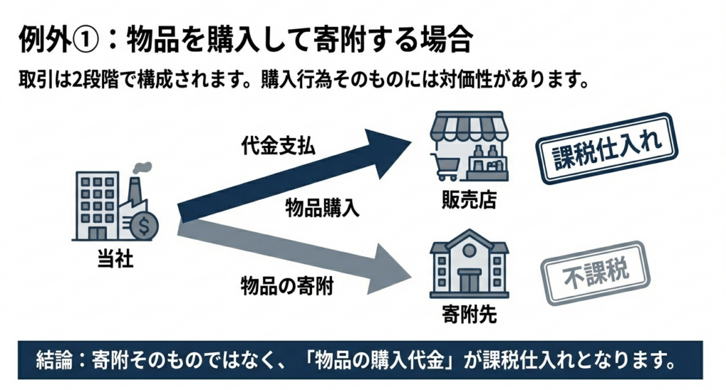 理由:寄附行為そのものではなく、物品の購入が課税取引であるため)