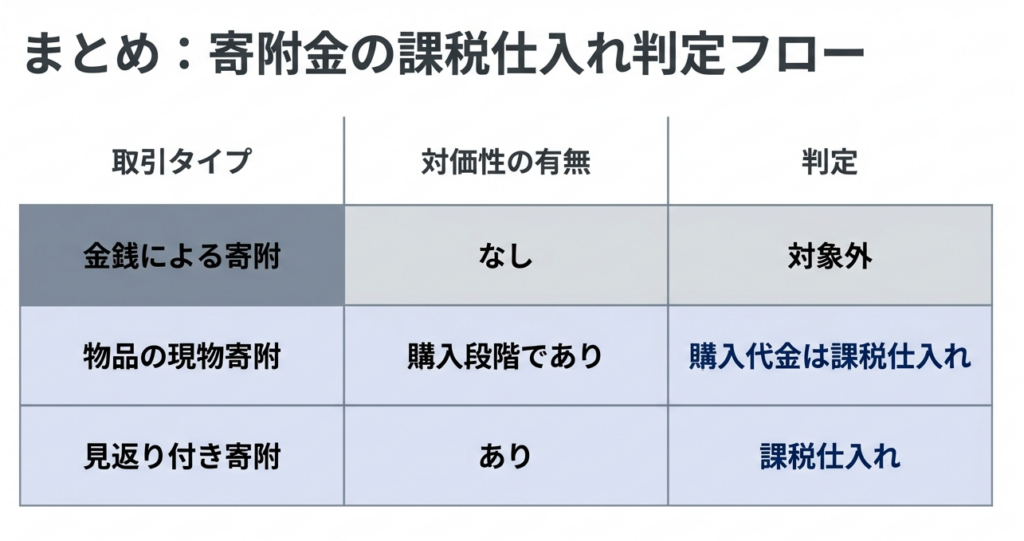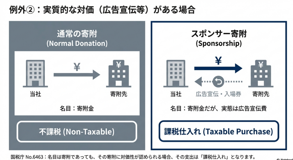 名目が寄附であっても、その寄附に対価性が認められる場合には、例外的に課税仕入れとして扱われます。