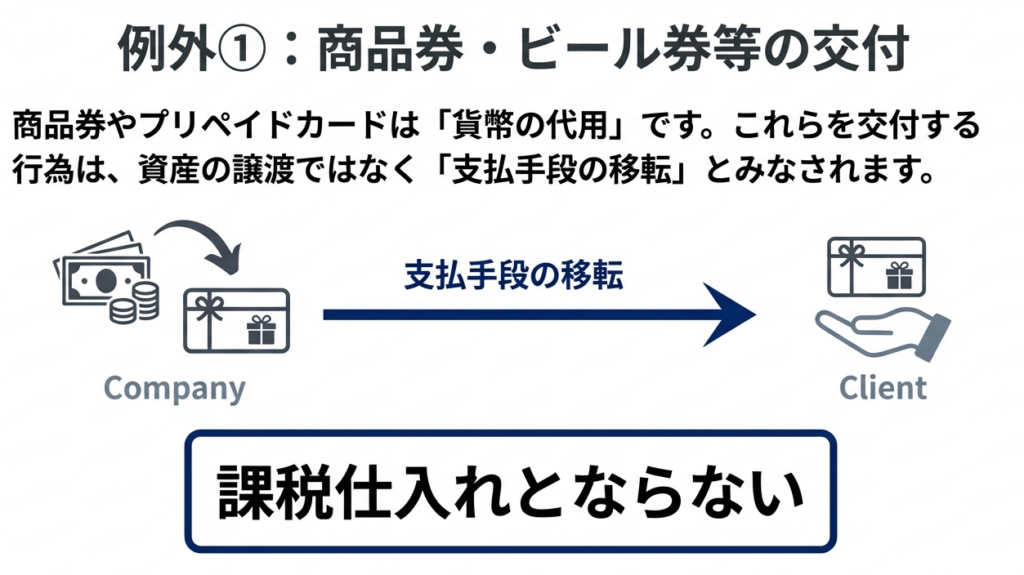 得意先へ商品券を交付した場合、その支出は課税仕入れに該当しません。これは物品の購入やサービスの提供といった対価性のある取引ではないためです。