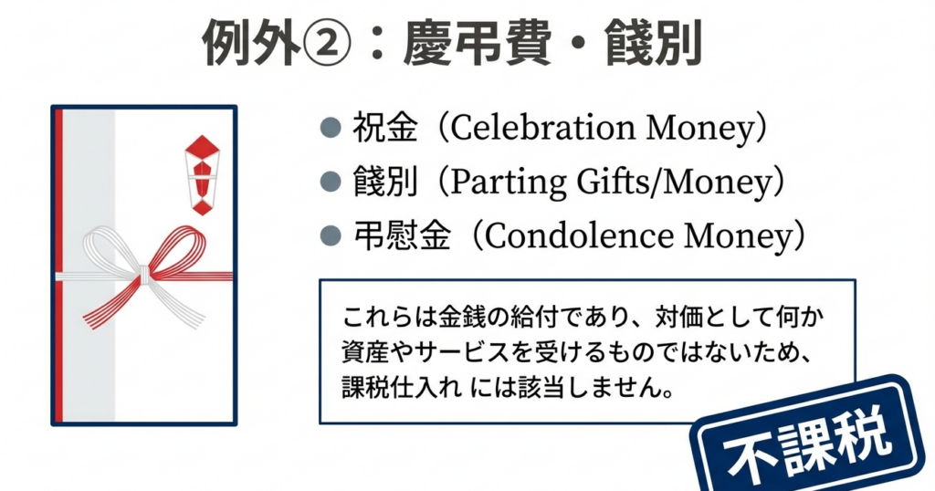 祝金や弔慰金などの支出は、物品の購入や役務の提供を伴わないため、対価性のある取引とは見なされず、課税仕入れとなりません。