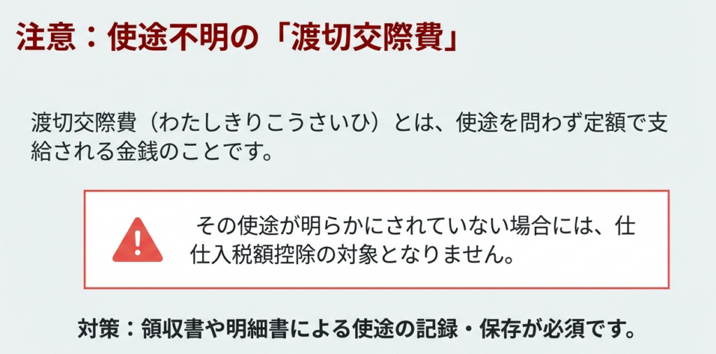 役員や従業員に一定額を渡し、その使途を精算不要とする「渡切交際費」については注意が必要です。その金銭が何のために使われたかが客観的に明らかにされていない場合、仕入税額控除の適用要件を満たさないため、課税仕入れとして処理することはできません。これは、その支出が事業のための課税仕入れ(例:接待飲食費)であったのか、あるいは個人的な支出や非課税の支出(例:祝金)であったのかを、税務当局が検証できないためです。