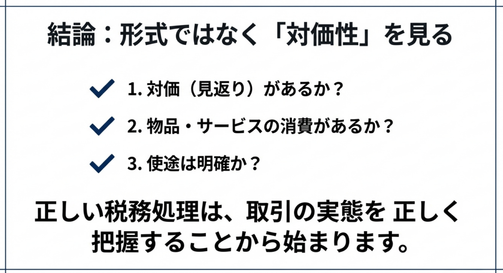 勘定科目が「寄附金」となっていても、その支出に実質的な対価性がないかを常に確認する癖をつけましょう。例えば、イベントへの協賛金が、パンフレットへの企業名掲載や広告宣伝効果を伴う場合、それは寄附ではなく広告宣伝費として課税仕入れに該当する可能性があります。税務の世界では、常に名称や勘定科目よりも取引の実態が優先されます。これは鉄則として覚えておいてください。
