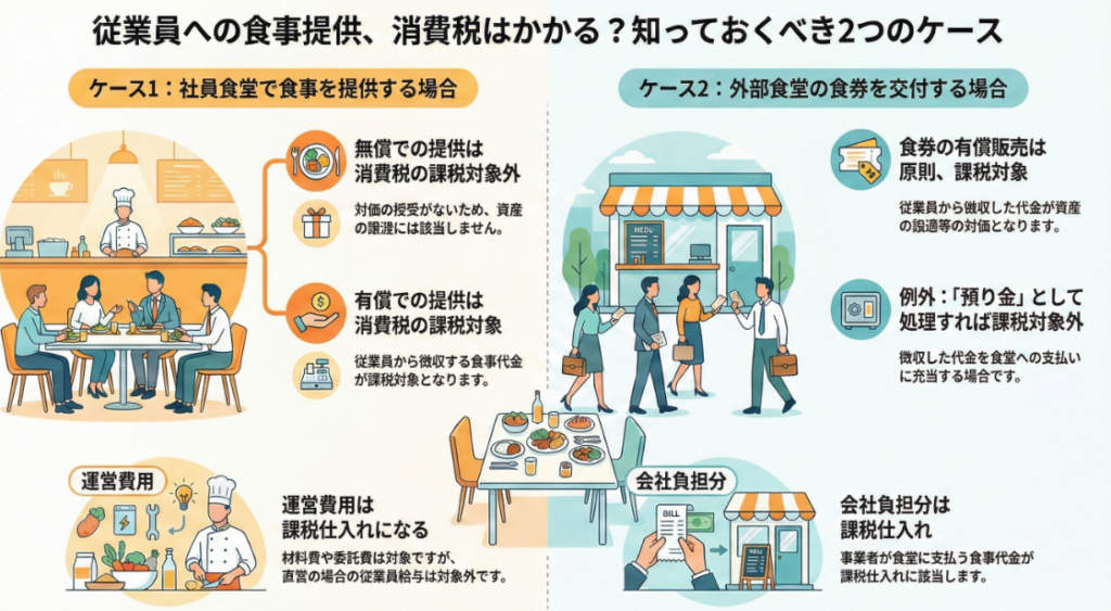 従業員への食事提供に係る消費税の扱いは、提供方法によって異なります。