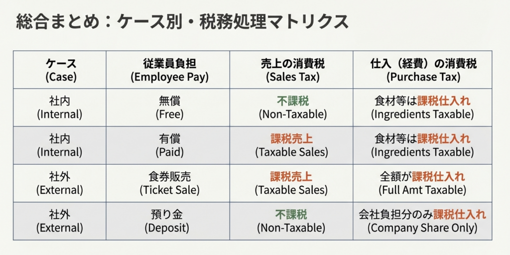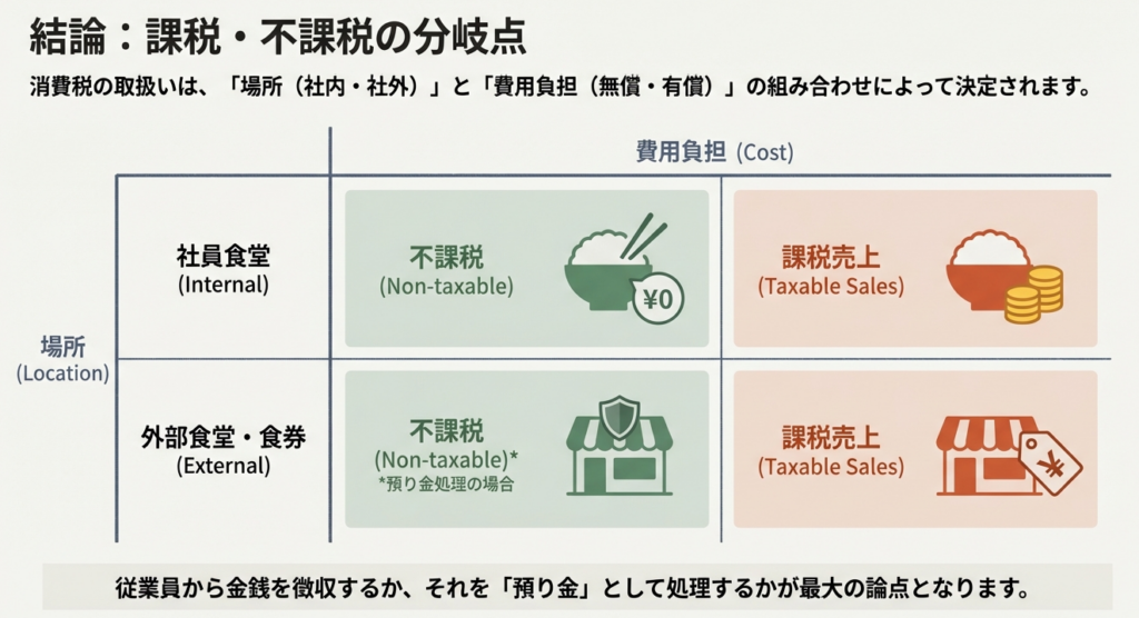 多忙な経理担当者の皆様が、日々の業務の中で迅速かつ正確な判断を下せるよう、まずは実務上の要点をまとめた結論から提示します。食事提供の形態によって消費税の課税関係がどのように変わるのか、以下の表でご確認ください。