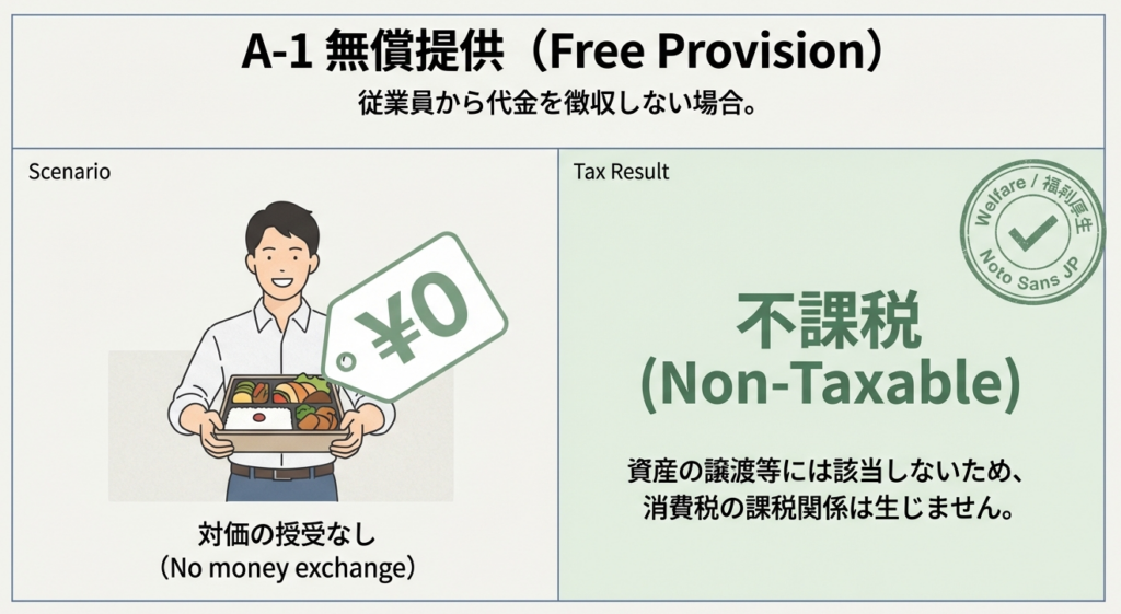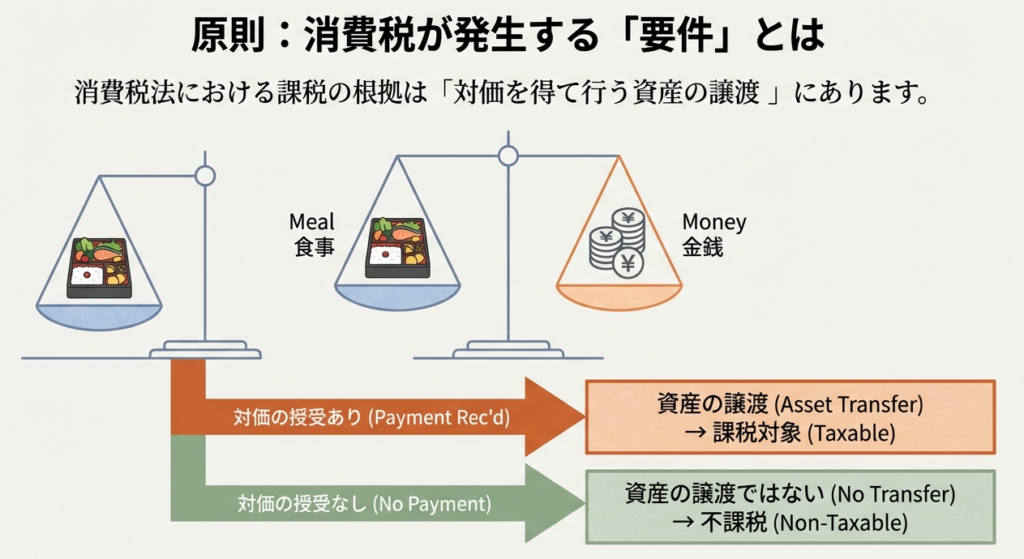 従業員に社員食堂の食事を無償で提供した場合、会社と従業員の間に金銭(対価)のやり取りが発生しません。そのため、これは事業としての「資産の譲渡等」には該当せず、消費税の課税関係は生じません